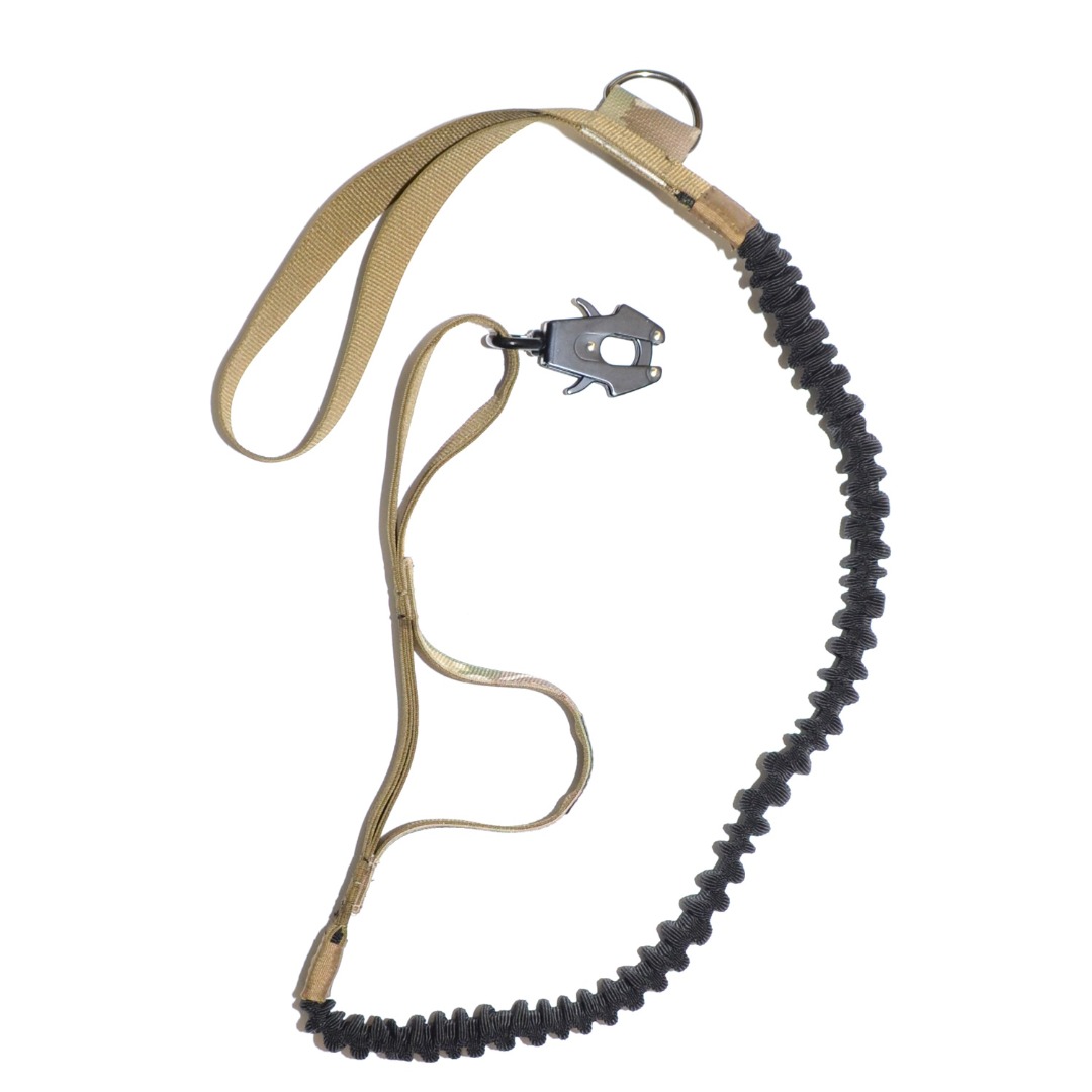 Тактический амортизирующий поводок при резком рывке питомца, растягивается компенсируя рывок, после ослабления возвращается в исходное состояние, оборудован металлически быстросъёмным карабином и кольцом крепления на пояс.