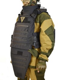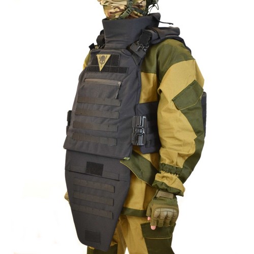 Бронежилет 5 класса защиты которую обеспечивают две плиты, спереди и сзади и защитой от осколков, которая обеспечивается баллистическими пакетами установленными по всей площади, сшит из прочной ткани рассеивающей ИК излучение.