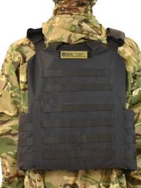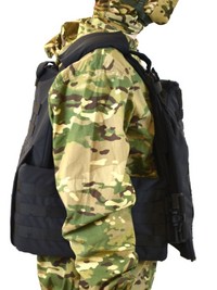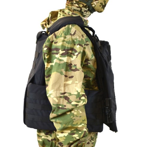 Бронежилет пятого класса защиты и противоосколочной защитой по кругу изготовлен из ткани Condura ИК-ремиссия, рассеивающей инфракрасное излучение прицелов и СВМПЭ, установлены 2 плиты.