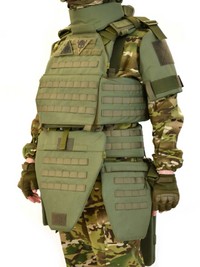 Полный штурмовой бронежилет "Олива" 5-го класса защиты, включающий плитник, напашник, защиту шеи, плеч, бёдер, пятиточечник и боевой пояс, комплектуется плитами и баллистическими, антиосколочными вставками.