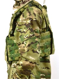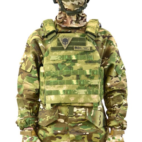 Представлен в камуфляже A-TACS FG, в его конструкцию входят надежные материалы: прочная ткань и баллистический пакет из СВМП, гарантирующие эффективную защиту от пистолетного огня с пониженной начальной скоростью полета пули, а также от холодного оружия и осколочных элементов.
