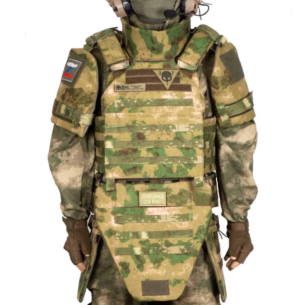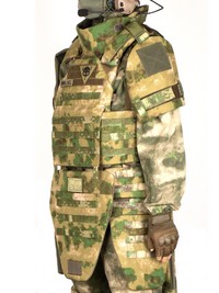 Комплект включает в себя стандартный бронежилет - плитник но помимо двух плит укомплектованный четырьмя баллистическими из СВМПЭ/Арамид, который находится внутри всех остальных модулей и обеспечивает противоосколочную защиту по всей площади штурмового бронежилета а именно: