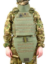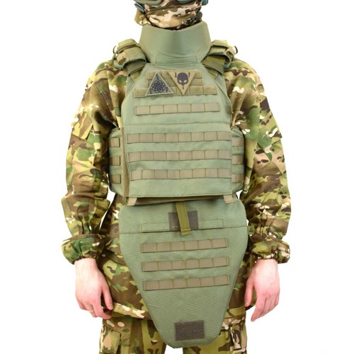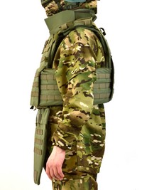 Защита паха выполнена с учётом анатомии и необходимости сохранять подвижность при переползании, преодолении препятствий и работе в ограниченном пространстве, модуль крепится к основной платформе без люфтов и смещений, оставаясь на месте даже при интенсивных перемещениях. Защита шеи прикрывает ключичную область и шейные позвонки от осколков и рикошетов, её форма не ограничивает обзор и не мешает прицеливанию, что критически важно для стрелка в любом положении.